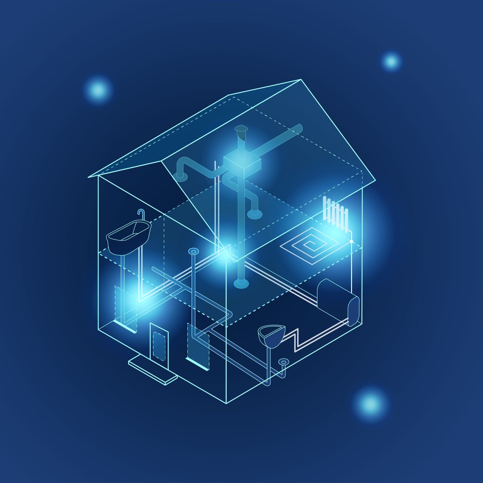 Нарисовать схематичную иллюстрацию дома с визуализацией его внутренних систем: водоснабжения, вентиляции, отопления и канализации. Гармонично вписать иллюстрацию в баннер на прототипе сайта. Задан основной шрифт Roboto Condensed и синий цвет баннера.